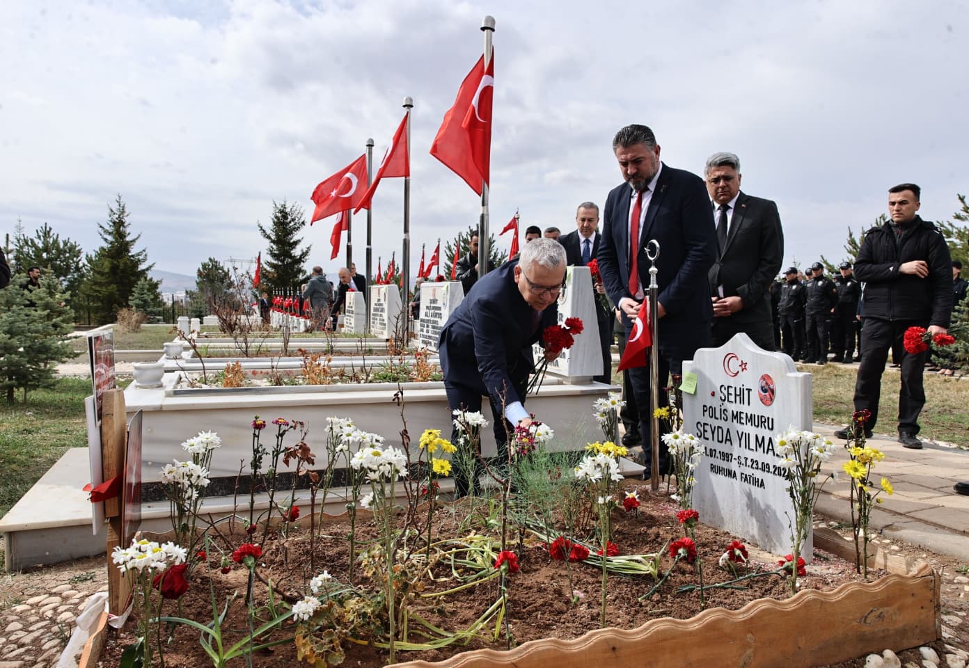Sayın Valimiz Yılmaz Şimşek, Garnizon 5’inci Piyade Tugay Komutanımız Piyade Albay Cüneyt Mutlu, Belediye Başkanımız Adem Uzun ve protokol üyeleri ile birlikte, aziz şehitlerimizin anısına çelenk sunduk. Ardından, şehit ailelerimiz ve gazilerimizle birlikte şehitlerimizin kabirlerini ziyaret ederek dualar ettik ve naaşlarına karanfiller bıraktık.